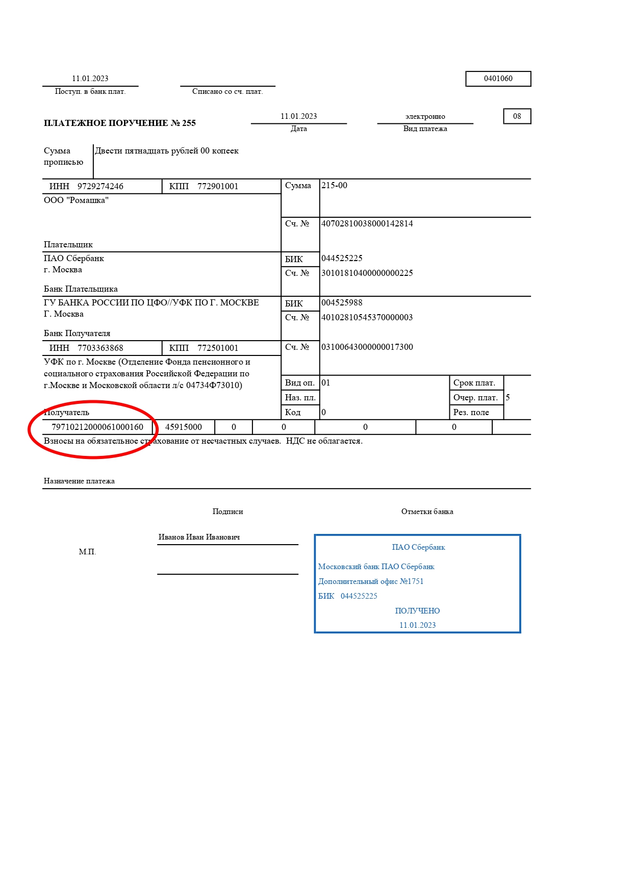 Получатель: УФК по г. Москве (Отделение Фонда пенсионного и социального страхования Российской Федерации по г. Москве и Московской области л/с 04734Ф73010)