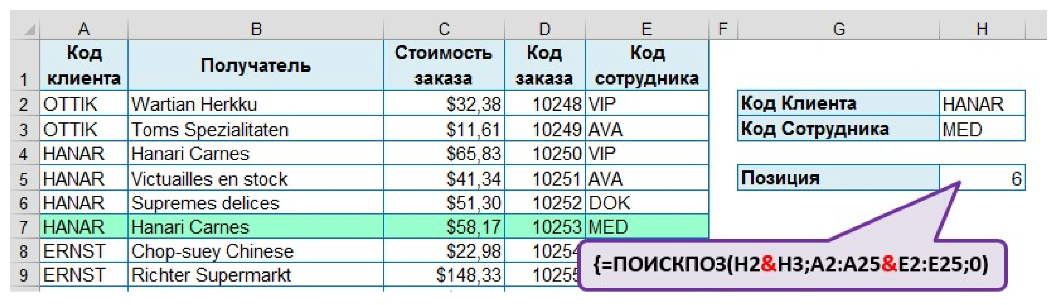 {=ПОИСКПОЗ(H2&H3;A2:A25&E2:E25;0)} — определение позиции в таблице (номер строки), в которой одновременно находится Код клиента HANAR (значение ячейки Н2) и Код сотрудника MED (значение ячейки Н3).