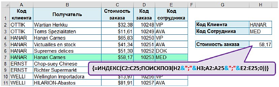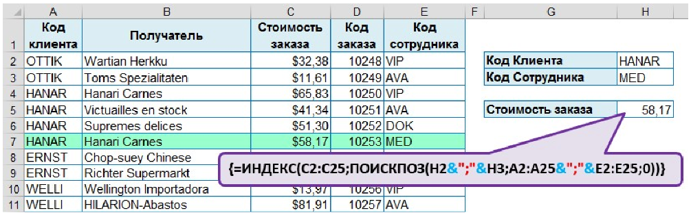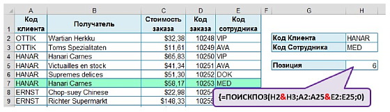 {=ИНДЕКС(C2:C25;ПОИСКПОЗ(H2&";"&H3;A2:A25&";"&E2:E25;0))} — определение значения Стоимости заказа (ячейки C2:C25) из строки, в которой одновременно находится Код клиента HANAR (значение ячейки Н2) и Код сотрудника MED (значение ячейки Н3).