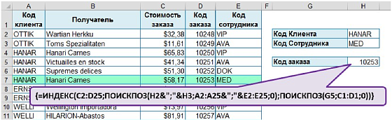 {=ИНДЕКС(C2:D25;ПОИСКПОЗ(H2&";"&H3;A2:A25&";"&E2:E25;0);ПОИСКПОЗ( G5;C1:D1;0))} — определение значения из диапазона ячеек C2:D25, получаемого на пересечении номера строки, в которой одновременно находится Код клиента HANAR (значение ячейки Н2) и Код сотрудника MED (значение ячейки Н3) и номером столбца, определяемым в зависимости от выбранного заголовка Код заказа или Стоимость заказа (значение ячейки G5).
